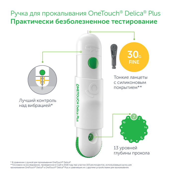 - * В сравнении с ручкой для прокалывания OneTouch® Delica®.