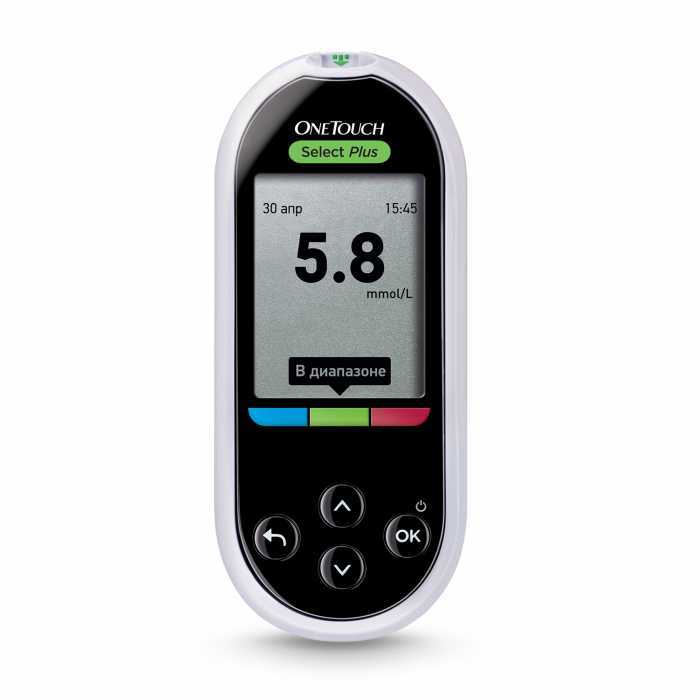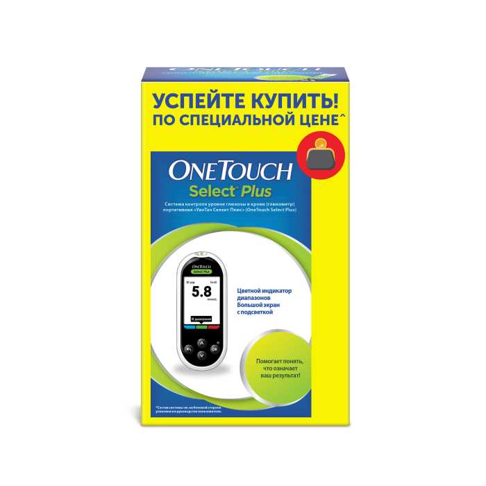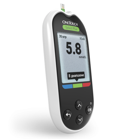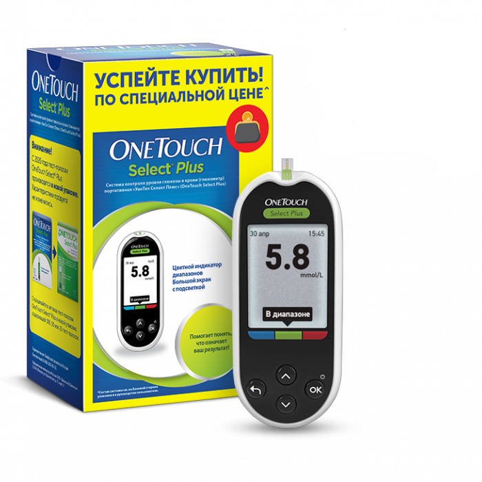 Глюкометр OneTouch Select® Plus подойдет людям, которые стремятся улучшить управление диабетом. Он имеет расширенный набор функций – цветовые подсказки, отметки до и после еды, средние значения, настройку индивидуальных целевых значений. Меню на русском языке помогает легко настроить глюкометр.